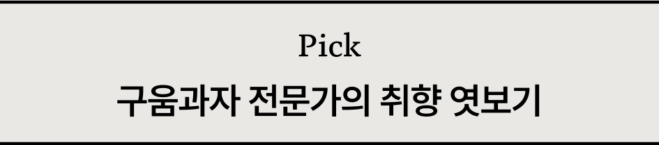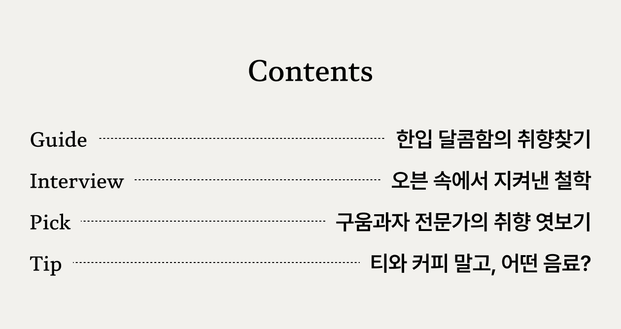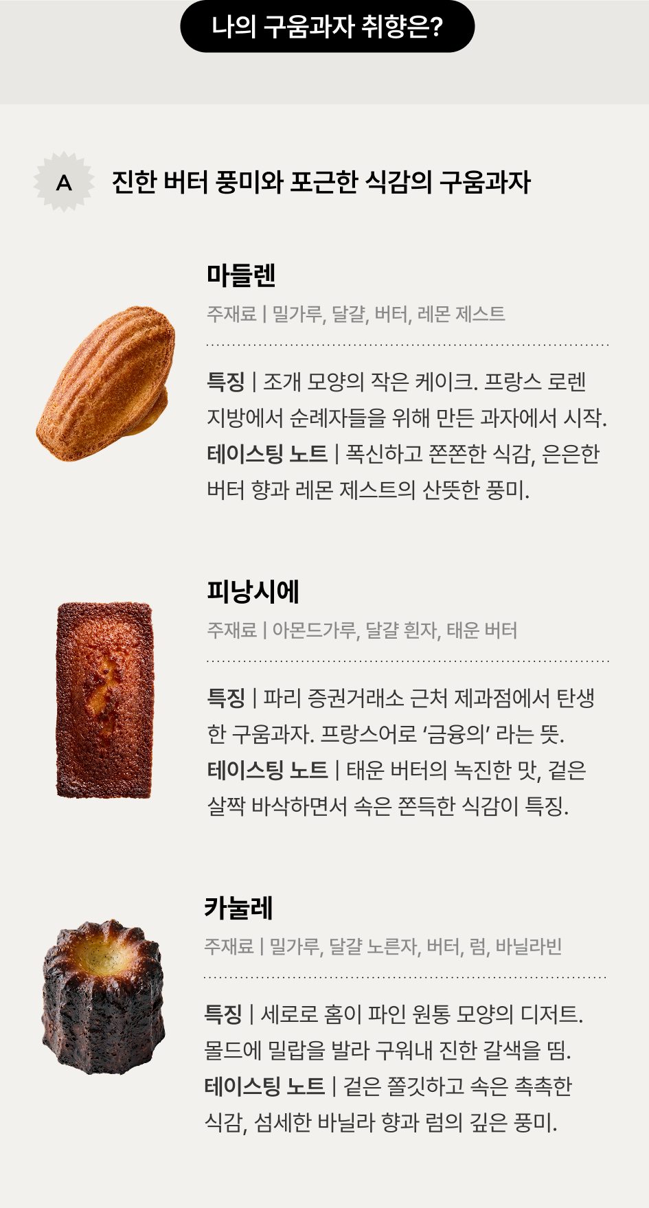 구움과자의 뜻은 이름 그대로입니다. 버터와 설탕, 달걀, 밀가루를 반죽해 오븐에 구워서 만든 제과류를 일컬어요. 대개 크기가 작고 풍미가 진해 커피나 차를 곁들여 즐기죠. 우리에게 친숙한 디저트 메뉴인 마들렌, 피낭시에, 카눌레가 구움과자에 속합니다. 머랭과자의 일종인 마카롱과 다쿠아즈, 그 밖에 사블레, 플로랑탱 같은 쿠키류도 포함되죠. 세상의 많은 달콤함 중 구움과자가 특별히 사랑받는 이유는 무엇일까요? 프루스트는 1인칭 소설 <잃어버린 시간을 찾아서>에서 마들렌 조각과 함께 차를 머금는 순간 감미로운 쾌감이 번져들었다고 했어요. 유년 시절의 기억을 불러온 감각, 삶을 잠깐 멈추고 존재의 의미를 떠올렸다고 전하죠. 구독자 멤버님이 즐기는 구움과자는 인생의 어떤 순간으로 데려다줄까요? 원하는 풍미와 식감에 따라 취향에 맞는 구움과자를 찾아 행복의 조각을 맞춰보세요.