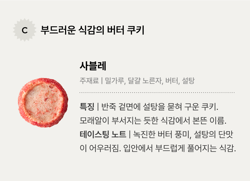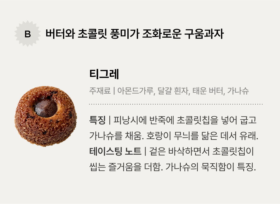매일 먹어도 질리지 않는 구움과자를 제안하고 싶었어요. 아직까지 국내에서 잘 알려지지 않은 푀이테 프로마쥬, 갈레트를 비롯해 사블레, 누가틴 등에 한국 식재료의 플레이버를 입혀 다양하게 선보일 계획이에요.