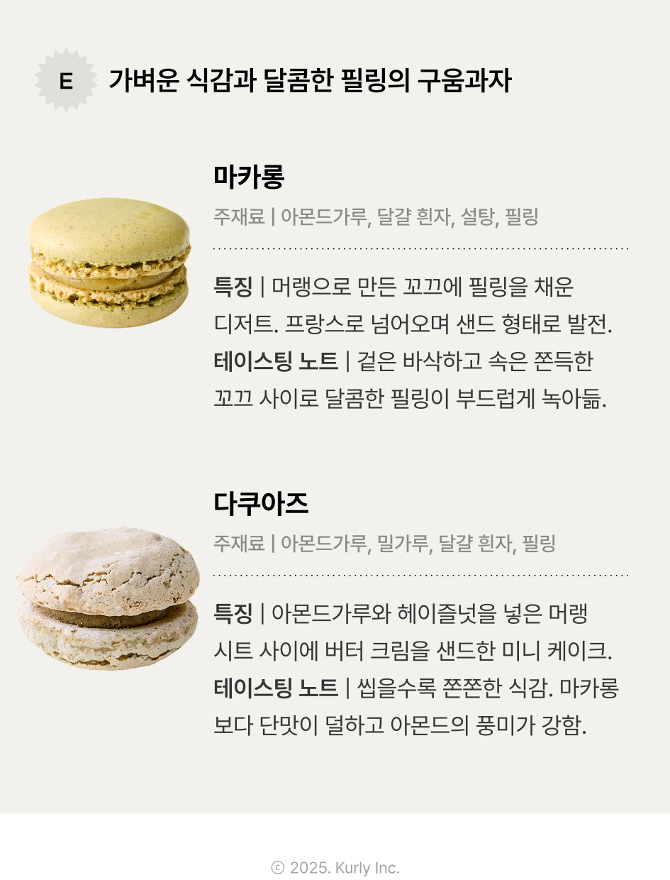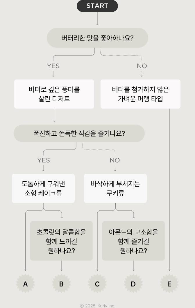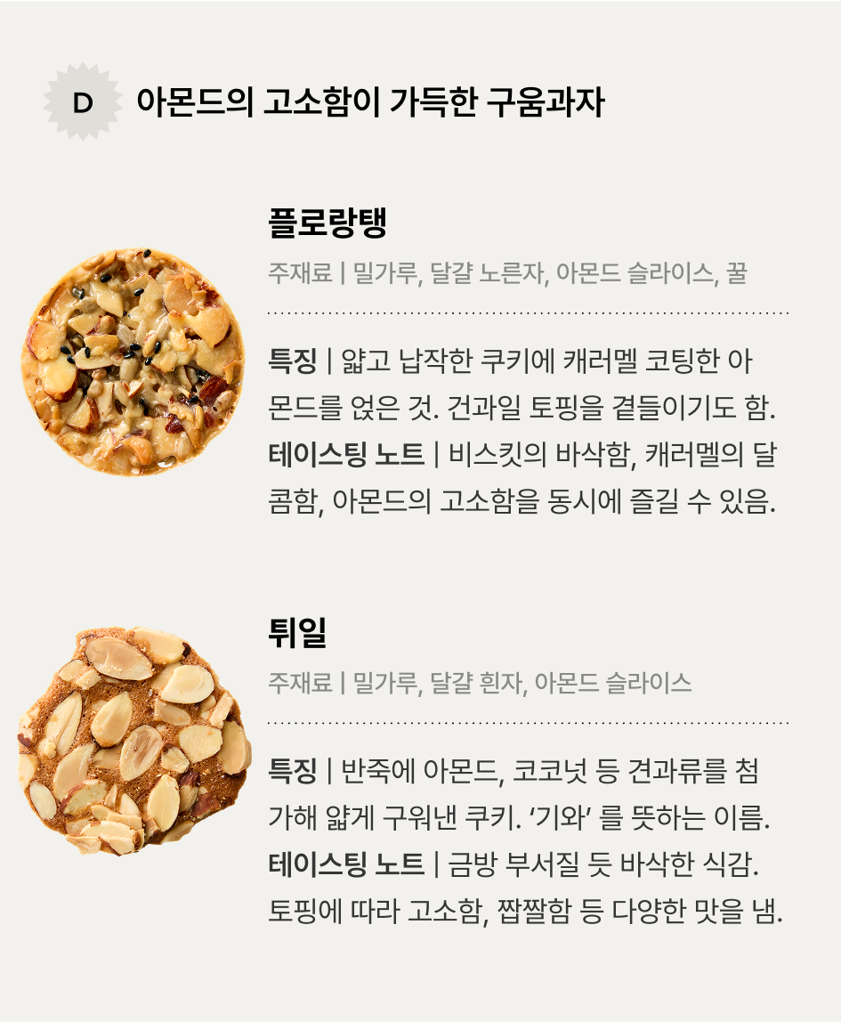 기본 재료인 버터의 유무에서 시작해 초콜릿, 아몬드 등 부재료를 더하며 다채로워지는 구움과자 라인업. 사다리를 따라가며 입맛과 취향에 맞는 구움과자를 찾아보세요.