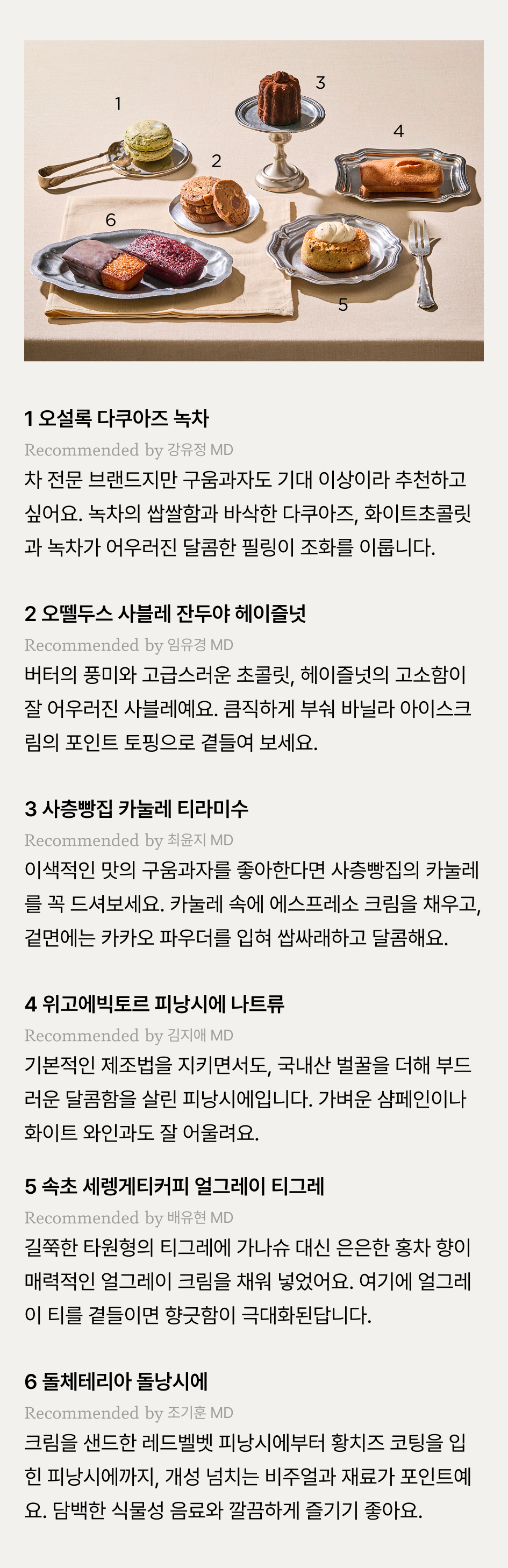 수십 번의 테이스팅과 논의를 거쳐 엄선된 구움과자만을 선보이는 컬리의 베이커리 팀. MD 6인의 취향과 전문성을 바탕으로, 컬리에서 꼭 맛봐야 할 구움과자를 추천할게요.