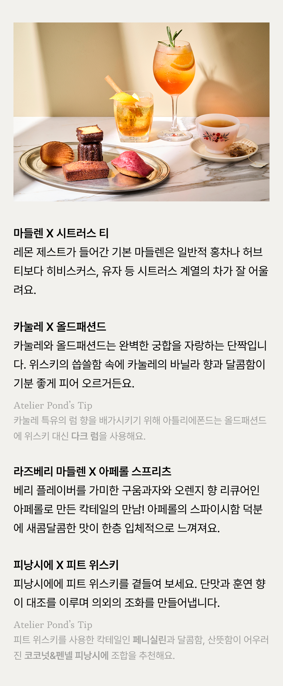 구움과자에 티와 커피를 곁들이는 건 기본이죠. 플레이버에 따라 알코올 음료까지 폭넓은 조합이 가능합니다. 구움과자와 칵테일을 함께 선보이는 '아틀리에폰드'의 이색 페어링 팁도 담았어요.