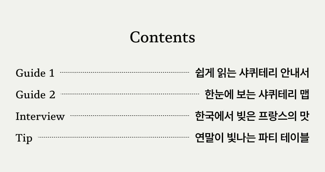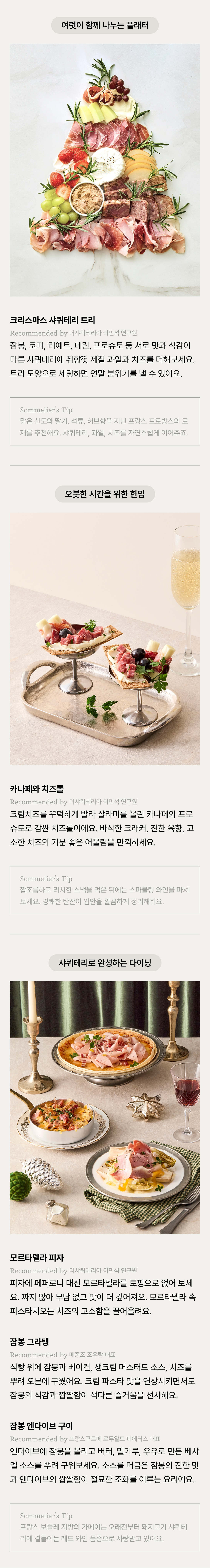 ‘샤퀴테리’라는 단어에는 어떤 믿음이 담겨 있습니다. 정성과 시간이 고스란히 스며 있다는 기대일지도 모르겠어요. 겉으로는 비슷한 염장 고기처럼 보이지만 햄, 소시지, 리예트, 테린은 만드는 방식과 더해지는 재료에 따라 전혀 다른 맛과 향, 질감을 가집니다. 그래서 샤퀴테리는 그 자체로 충분히 하나의 요리가 됩니다. 이번 에피큐어는 샤퀴테리를 더 깊게 즐기기 위한 두 번째 안내서예요. 종류마다 다른 가공법과 향신료, 시간이 만든 깊이를 차근히 살펴보고, 장인이 빚은 정통 샤퀴테리를 경험한 뒤 크리스마스를 위한 요리까지 이어지는 흐름을 담았습니다. 구독자 멤버님의 취향에 닿는 한 점을 지금부터 천천히 찾아보세요.
