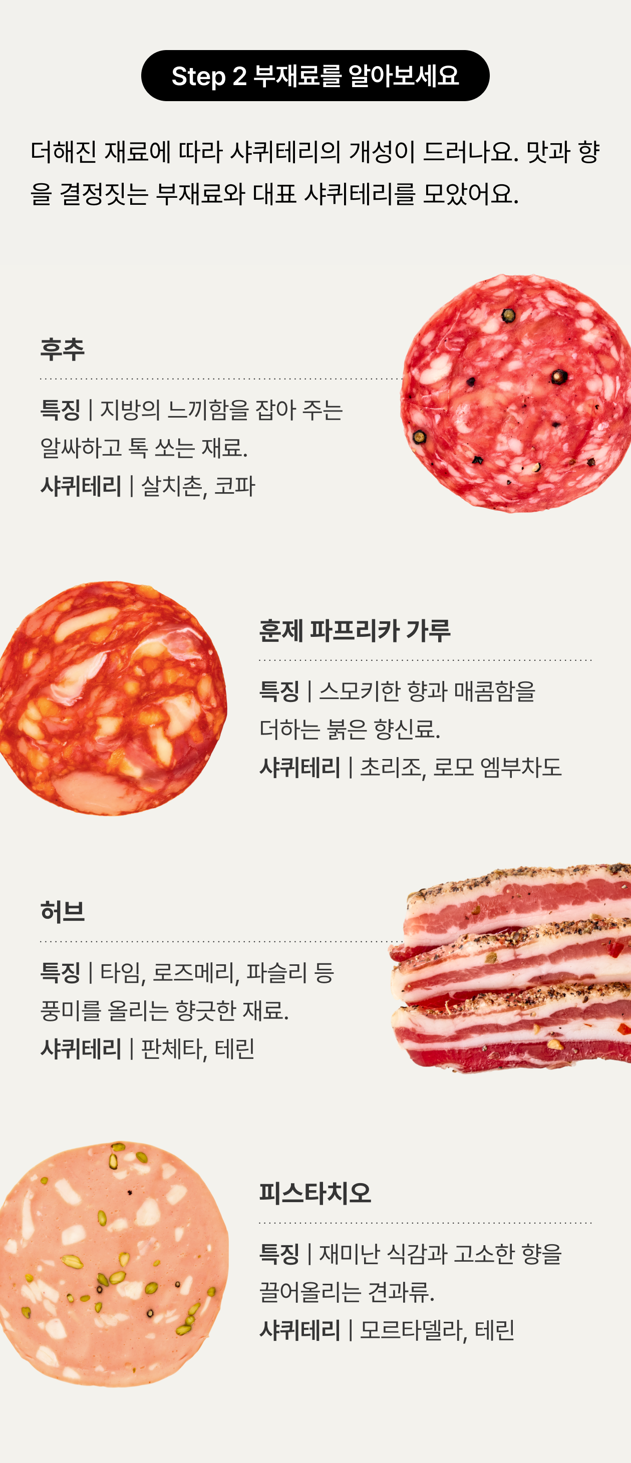 알듯 말듯 헷갈리는 샤퀴테리 세계. 맛과 풍미의 차이를 만드는 3가지 요소를 단계별로 따라가면 한 걸음 더 친해질 수 있어요.