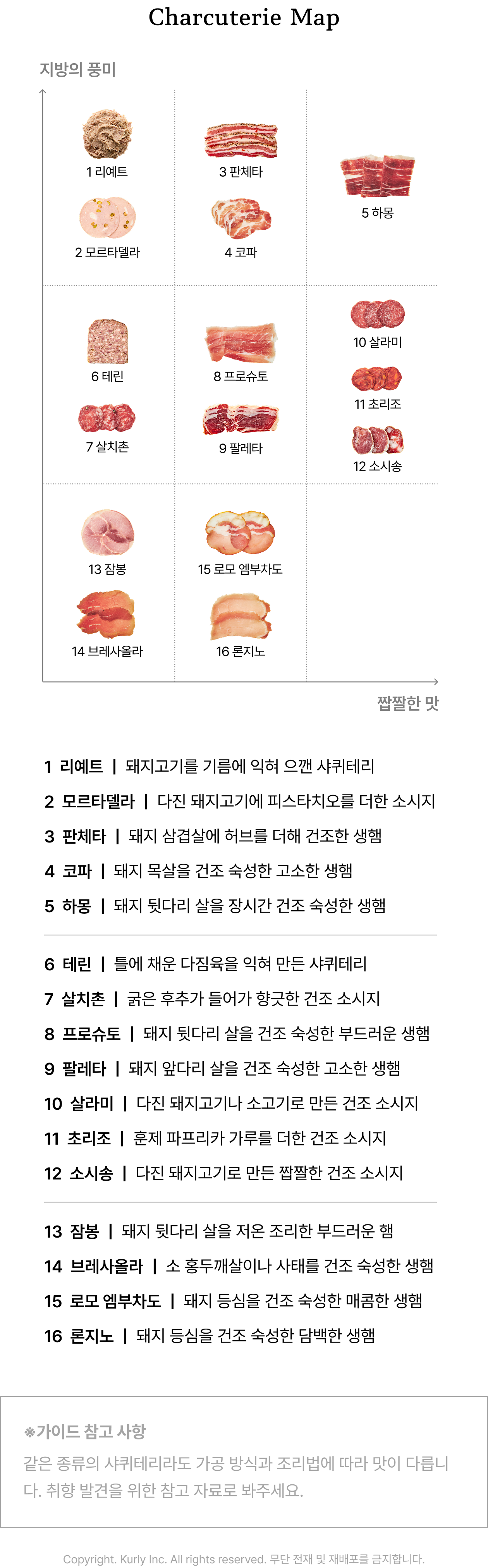 짭짤한 맛과 지방의 풍미를 축으로 샤퀴테리의 특징을 정리했어요. 미묘한 차이를 느끼며 취향을 찾아보세요.