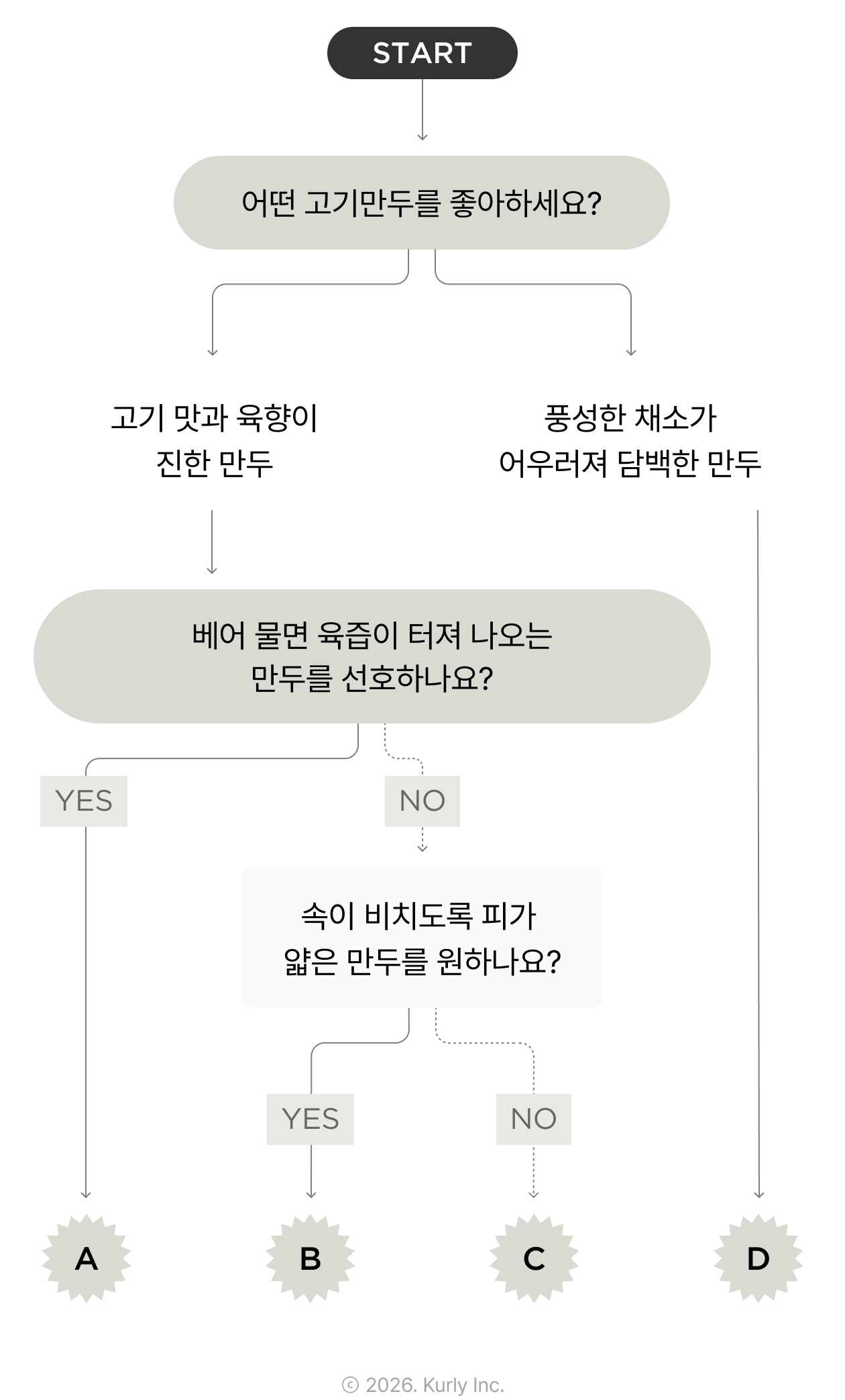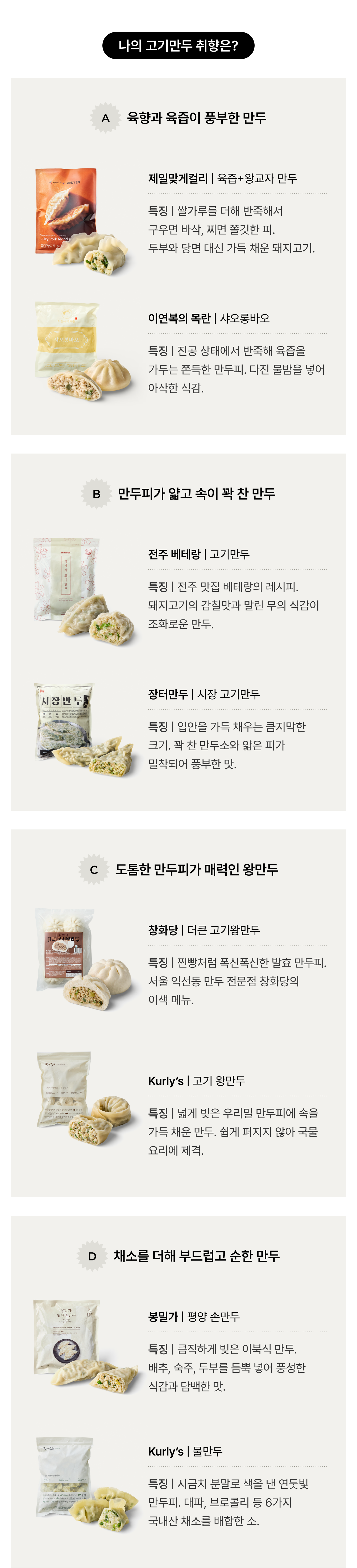 굽든 찌든 제 몫을 하는 만두가 많아진 만큼, 결국 재료의 차이가 선택을 가릅니다. 고기 맛의 농도, 육즙의 풍부함 정도, 만두피의 두께까지. 사다리를 따라가며, 나의 만두를 찾아보세요.