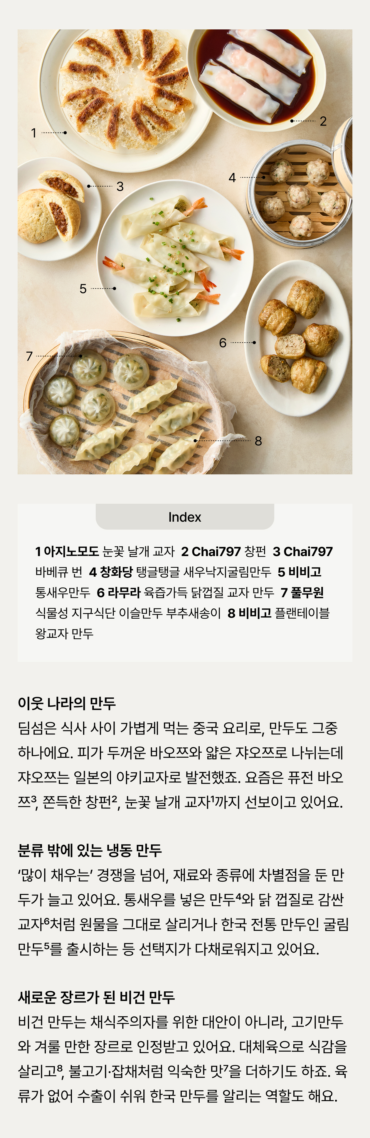 만두는 각국의 풍토에 맞게 고유의 색깔로 발전해 왔어요. 새로운 재료와 레시피가 더해지며 확장과 변주를 거듭하고 있죠. 익숙하면서도 낯선, 만두의 일곱 가지 얼굴을 만나보세요.